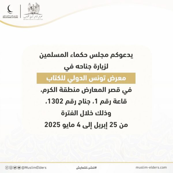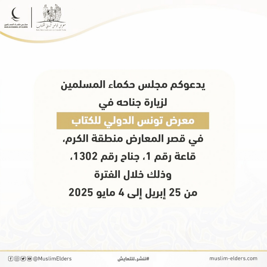 يشارك مجلس حكماء المسلمين بجناح خاص في الدورة الـ 39 من معرض تونس الدولي للكتاب، الذي ينعقد خلال الفترة من 25 أبريل إلى 4 مايو 2025؛ وذلك انطلاقًا من رسالة المجلس الهادفة إلى تعزيز السِلم ، وترسيخ قيم الحوار والتسامح ومد جسور التعاون والتعايش الإنساني.