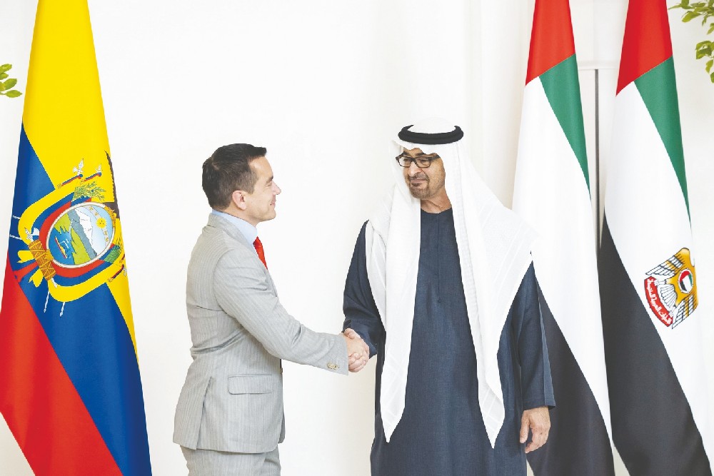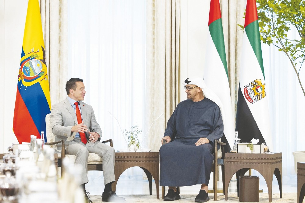 من جانبه، عبر فخامة رئيس الإكوادور عن شكره إلى صاحب السمو الشيخ محمد بن زايد آل نهيان لحفاوة الاستقبال مؤكداً حرص بلاده على تعزيز علاقاتها مع الإمارات خاصة في المجالات الاقتصادية.