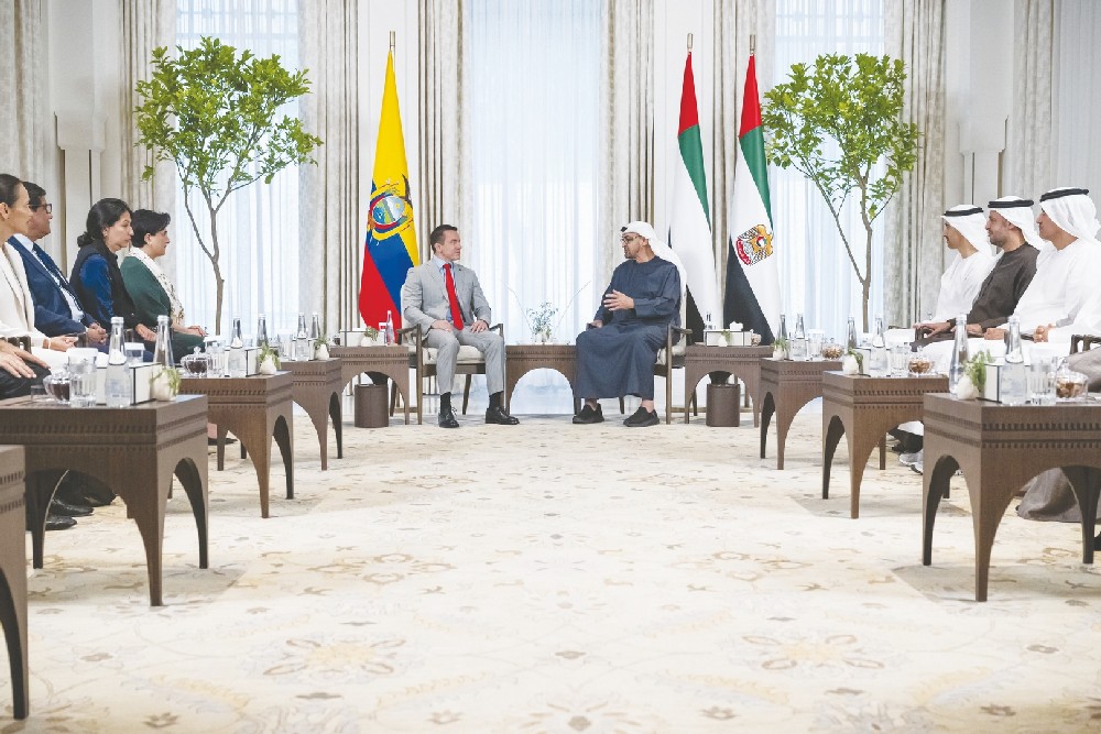بحث صاحب السمو الشيخ محمد بن زايد آل نهيان رئيس الدولة “حفظه الله” وفخامة دانيال نوبوا رئيس جمهورية الإكوادور، أمس، مسارات العمل المشترك لتعزيز العلاقات الثنائية خاصة في مجالات الاقتصاد والتجارة والطاقة المتجددة والاستدامة والاستثمار والسياحة والزراعة وغيرها، بما يعود بالخير والازدهار والتنمية على البلدين والشعبين.