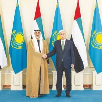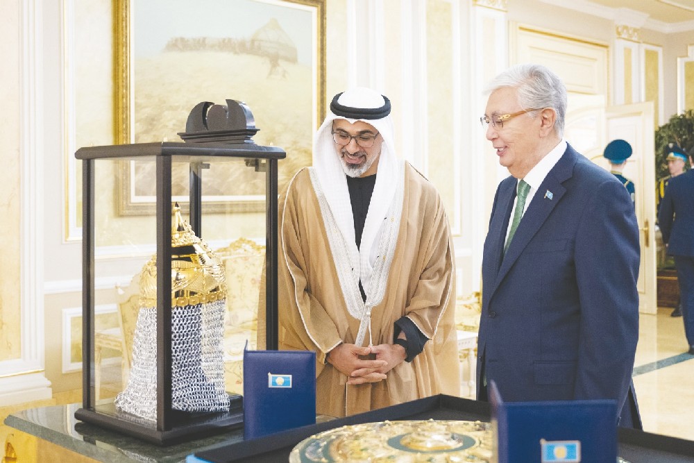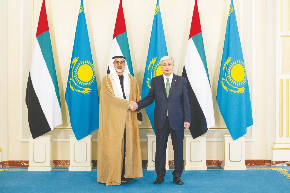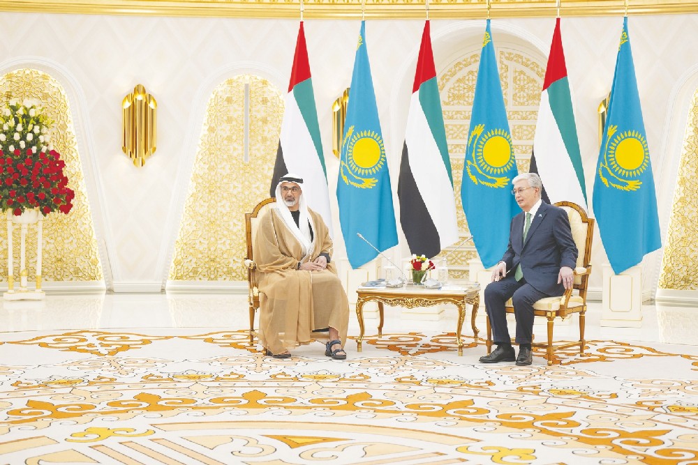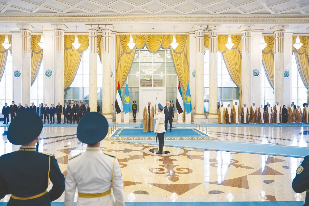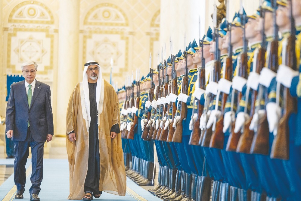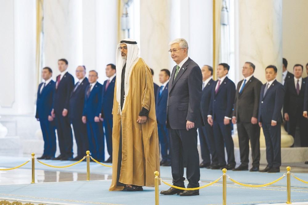 وكان سمو الشيخ خالد بن محمد بن زايد آل نهيان، ولي عهد أبوظبي، وصل إلى القصر الرئاسي في العاصمة الكازاخستانية أستانا، حيث كان في مقدمة مستقبلي سموّه لدى وصوله فخامة قاسم جومارت توكاييف، رئيس جمهورية كازاخستان.