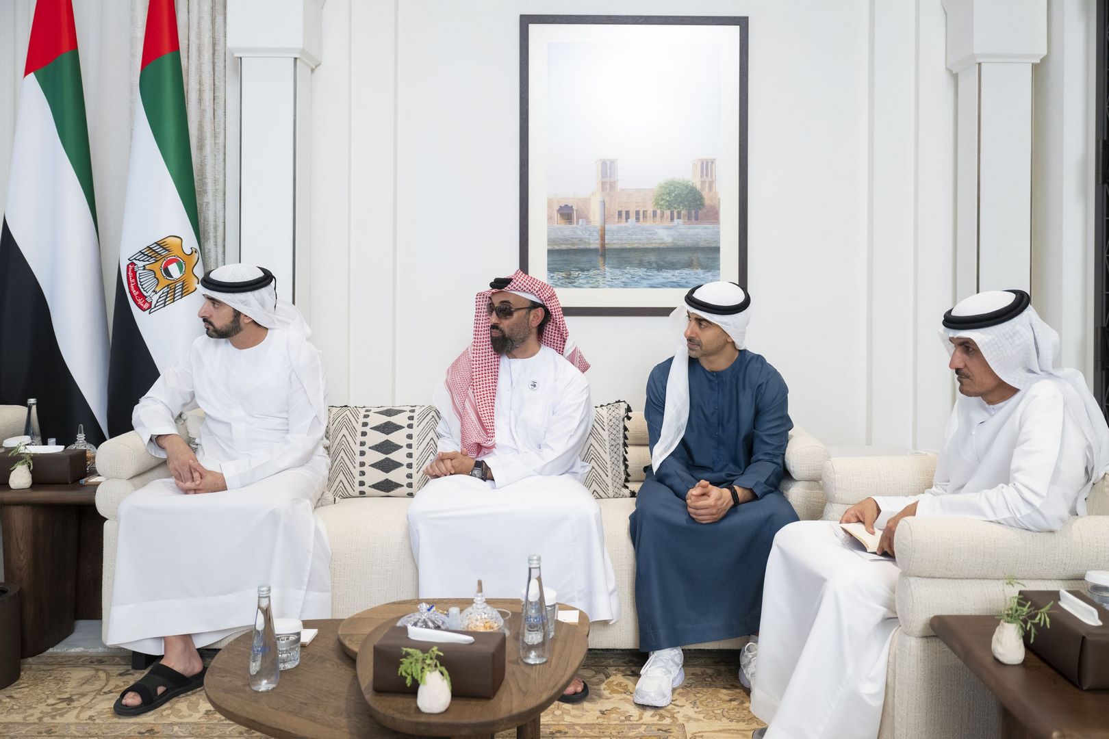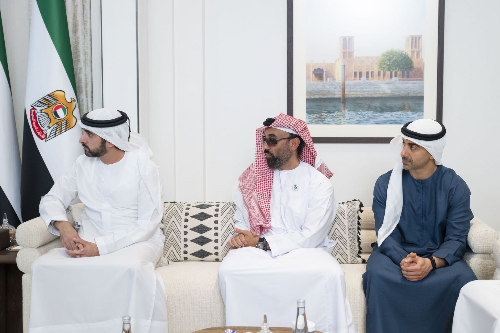 حضر اللقاء .. سمو الشيخ حمدان بن محمد بن راشد آل مكتوم ولي عهد دبي نائب رئيس مجلس الوزراء وزير الدفاع وسمو الشيخ طحنون بن زايد آل نهيان نائب حاكم إمارة أبوظبي مستشار الأمن الوطني وسمو الشيخ حمدان بن محمد بن زايد آل نهيان نائب رئيس ديوان الرئاسة للشؤون الخاصة ومعالي الشيخ محمد بن حمد بن طحنون آل نهيان مستشار رئيس الدولة ومعالي علي بن حماد الشامسي الأمين العام للمجلس الأعلى للأمن الوطني ومعالي الدكتور أحمد مبارك المزروعي رئيس مكتب رئيس الدولة للشؤون الإستراتيجية رئيس مكتب أبوظبي التنفيذي وعدد من المسؤولين.