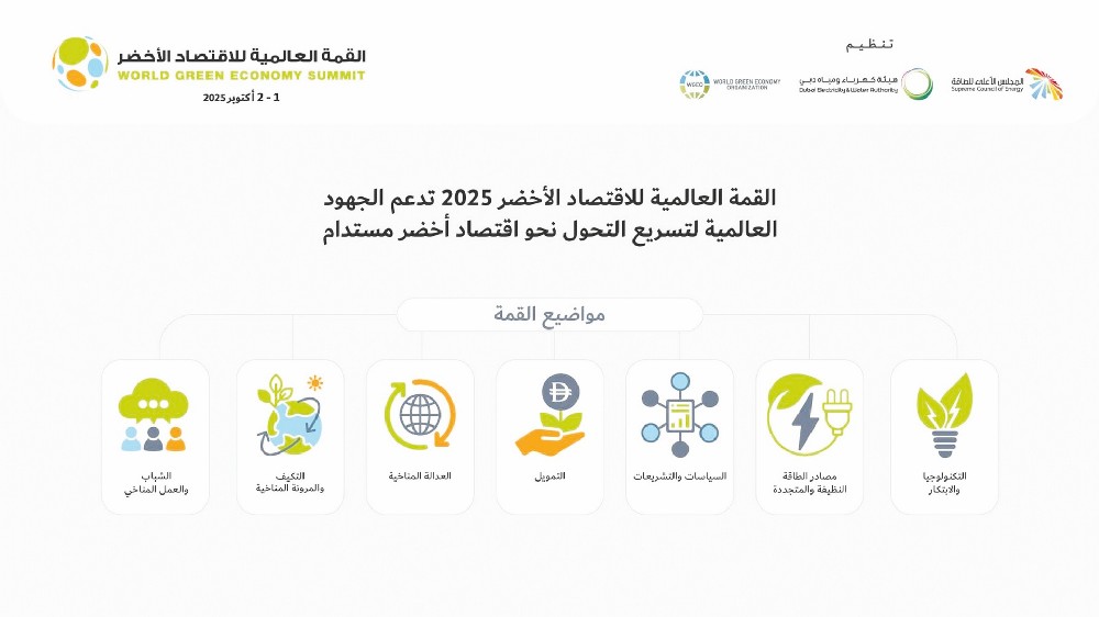 وتشمل محاور القمة، التي ينظمها المجلس الأعلى للطاقة في دبي وهيئة كهرباء ومياه دبي والمنظمة العالمية للاقتصاد الأخضر، يومي 1 و2 أكتوبر المقبل في مركز دبي التجاري العالمي، تحت شعار “الابتكار المؤثر .. تسريع مستقبل الاقتصاد الأخضر”، التكنولوجيا والابتكار، ومصادر الطاقة النظيفة والمتجددة، والسياسات والتشريعات، والتمويل، والعدالة المناخية، والتكيف والمرونة المناخية، والشباب والعمل المناخي.