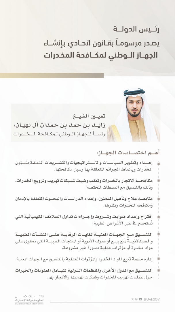 رئيس الدولة يصدر مرسوماً بقانون اتحادي بإنشاء “الجهاز الوطني لمكافحة المخدرات” برئاسة زايد بن حمد بن حمدان آل نهيان