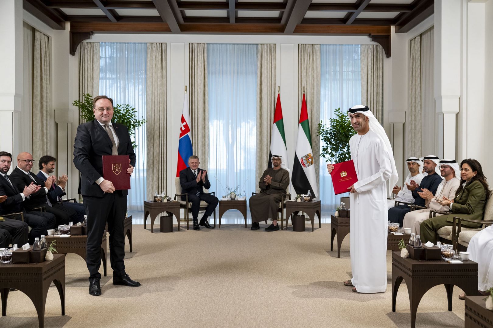 وقد شهد صاحب السمو رئيس الدولة ومعالي رئيس وزراء سلوفاكيا..تبادل اتفاقية تعاون في المجالات الاقتصادية بين حكومتي البلدين بجانب مذكرة تفاهم في المجال الاستثماري تبادلهما من جانب دولة الإمارات، معالي الدكتور ثاني بن أحمد الزيودي وزير التجارة الخارجية، ومن الجانب السلوفاكي سعادة فلاديمير سيمونياك أمين عام وزارة الاقتصاد.