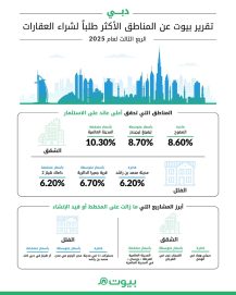 تُظهر اتجاهات البحث في موقع “بيوت”، أنه وعلى الرغم من أن ارتفاع أسعار العقارات شهد تباطؤاً خلال الربع الثالث من عام 2025، إلا أن أداء سوق دبي العقاري حافظ على استقراره، مع وجود طلب قوي على استئجار وشراء الشقق والفلل في المناطق الرئيسية، خاصة في ظل تجاوز عدد سكان الإمارة 4 ملايين نسمة.