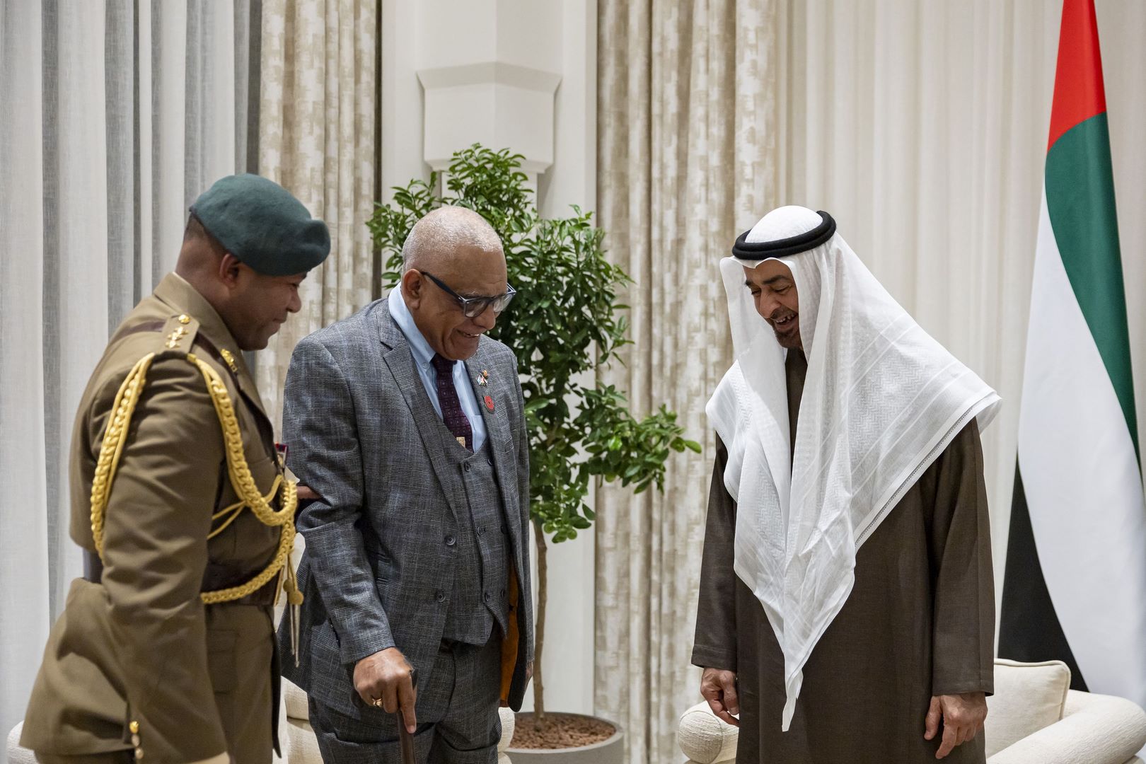 بحث صاحب السمو الشيخ محمد بن زايد آل نهيان رئيس الدولة “حفظه الله” وفخامة راتو نايكاما لالابالافو رئيس جمهورية فيجي، مختلف مسارات التعاون المشترك خاصة في المجالات الاقتصادية والتجارية والطاقة المتجددة والسياحة والزراعة وفرص تطويرها بما يحقق المصالح المتبادلة للبلدين ويخدم تطلعاتهما التنموية.