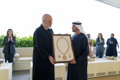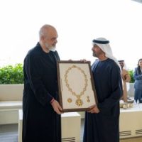 وأعرب معالي إيدي راما رئيس وزراء جمهورية ألبانيا عن شكره لصاحب السمو رئيس الدولة على حفاوة الاستقبال ..مؤكداً اعتزازه بتكريمه بـ”وسام زايد” الذي يجسد متانة روابط الصداقة بين البلدين وما يجمعهما من تعاون مشترك وأسس راسخة قائمة على الاحترام المتبادل والمصالح المشتركة.