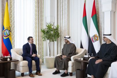بحث صاحب السمو الشيخ محمد بن زايد آل نهيان رئيس الدولة “حفظه الله” وفخامة دانيال نوبوا رئيس جمهورية الإكوادور أمس مختلف جوانب العلاقات الثنائية وسبل تعزيزها خاصة في المجالات التنموية وفي مقدمتها الاقتصاد والتجارة والطاقة المتجددة والاستثمار والاستدامة والأمن الغذائي وغيرها من المجالات التي تخدم مصالحهما المتبادلة وبما يعود بالخير والنماء على شعبيهما.