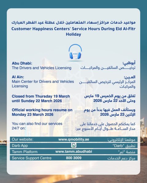 وفيما يتعلق بخدمات مراكز إسعاد المتعاملين، أفادت الشركة بأن مراكز ترخيص السائقين والمركبات في كل من أبوظبي والعين، بما في ذلك المركز الرئيسي في مدينة العين، ستكون مغلقة خلال عطلة عيد الفطر، وذلك من الخميس 19 مارس وحتى الأحد 22 مارس.