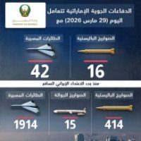ومنذ بدء الاعتداءات الإيرانية السافرة تعاملت الدفاعات الجوية الإماراتية مع 414 صاروخاً باليستياً، و15 صاروخا جوالا، و1914 طائرة مسيرة.
