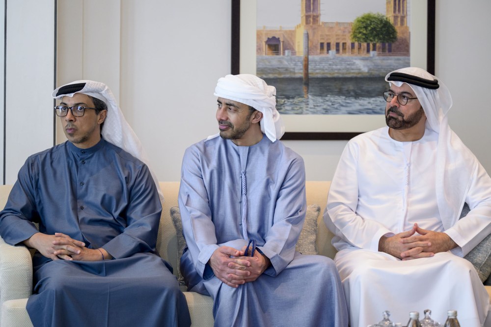 حضر اللقاء..سمو الشيخ منصور بن زايد آل نهيان، نائب رئيس الدولة نائب رئيس مجلس الوزراء، رئيس ديوان الرئاسة وسمو الشيخ عبدالله بن زايد آل نهيان نائب رئيس مجلس الوزراء وزير الخارجية وسمو الشيخ حمدان بن محمد بن زايد آل نهيان نائب رئيس ديوان الرئاسة للشؤون الخاصة ومعالي الشيخ محمد بن حمد بن طحنون آل نهيان، مستشار صاحب السمو رئيس الدولة وعدد من الوزراء والمسؤولين.